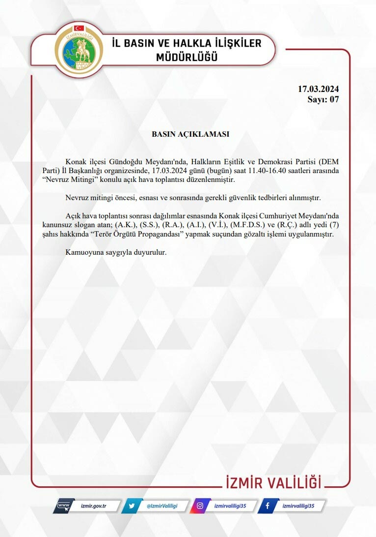 İZMİRin Konak ilçesinde, DEM Partinin düzenlediği nevruz etkinliğinde terör örgütü lehinde slogan attığı iddiasıyla 7 şüpheli gözaltına alındı.Halkların Eşitlik ve Demokrasi Partisi (DEM) İl Başkanlığı tarafından bugün öğlen saatlerinde Gündoğdu Meydanında nevruz etkinliği düzenlendi. Etkinliğin sona ermesinin ardından, meydanda kalarak terör örgütü lehine slogan attığı tespit edilen 7 şüpheli, polis tarafından gözaltına alındı. İzmir Valiliğinden yapılan açıklamada, “Açık hava toplantısı sonrası dağılımlar esnasında Konak ilçesi Cumhuriyet Meydanında kanunsuz slogan atan; A.K., S.S., R.A., A.I., V.İ., M.F.D.S. ve R.Ç. adlı yedi şahıs hakkında terör örgütü propagandası yapmak suçundan gözaltı işlemi uygulanmıştır.” denildi. Şüphelilerin emniyetteki işlemlerinin sürdüğü öğrenildi.