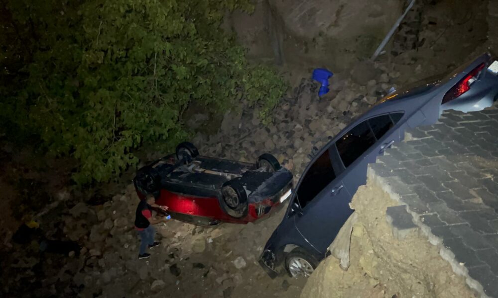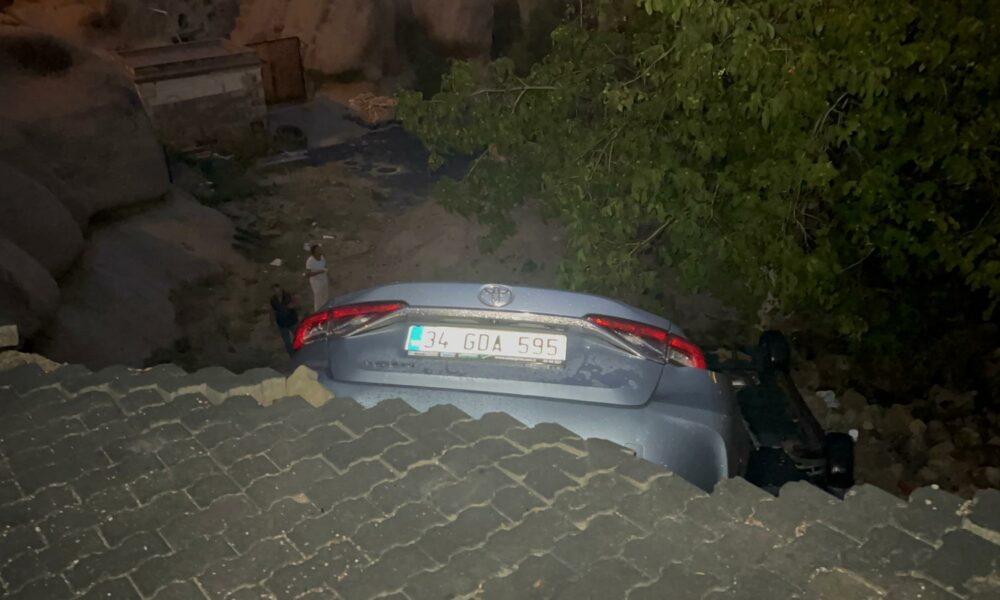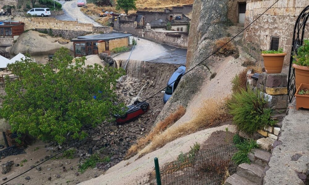 Nevşehir’de sağanak sele neden oldu; peribacalarından düşen kaya parçaları otomobillere zarar verdi