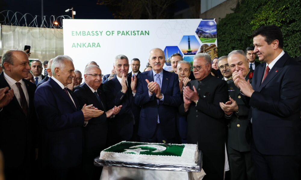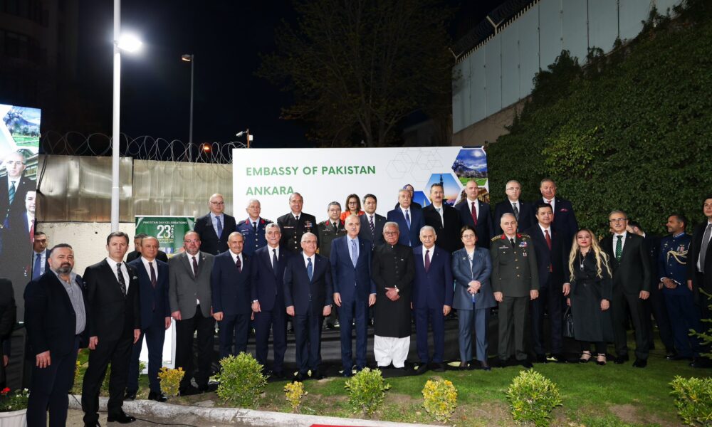Pakistan Milli Günü dolayısıyla Pakistan’ın Ankara Büyükelçisi Yousaf Junaid’ın ev sahipliğinde resepsiyon düzenlendi. Pakistan Büyükelçiliği’nde düzenlenen resepsiyona, TBMM Başkanı Numan Kurtulmuş, Milli Savunma Bakanı Yaşar Güler, Ticaret Bakanı Ömer Bolat, Eski Başbakan Binali Yıldırım, Eski TBMM Başkanı Bülent Arınç, Eski Adalet Bakanı Abdülhamit Gül, kuvvet komutanları, misyon şefleri ve askeri ataşeler katıldı. İki ülkenin milli marşlarının okunmasıyla başlayan etkinlikte, konuşmaların ardından davetlilere Pakistan’ın geleneksel mutfağından yemekler ikram edildi.