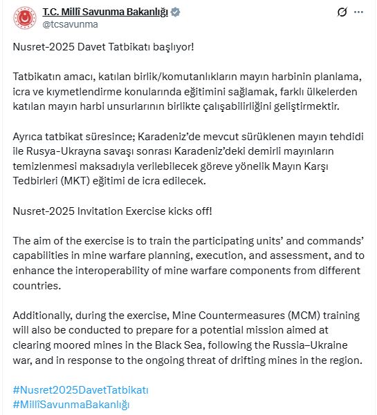 Bakanlığın sosyal medya hesabından 24-31 Ekimde düzenlenecek tatbikata ilişkin yapılan açıklamada, “Nusret-2025 Davet Tatbikatı başlıyor. Tatbikatın amacı, katılan birlik/komutanlıkların mayın harbinin planlama, icra ve kıymetlendirme konularında eğitimini sağlamak, farklı ülkelerden katılan mayın harbi unsurlarının birlikte çalışabilirliğini geliştirmektir. Ayrıca tatbikat süresince; Karadenizde mevcut sürüklenen mayın tehdidi ile Rusya-Ukrayna savaşı sonrası Karadenizdeki demirli mayınların temizlenmesi maksadıyla verilebilecek göreve yönelik mayın karşı tedbirleri eğitimi de icra edilecek” ifadelerine yer verildi.