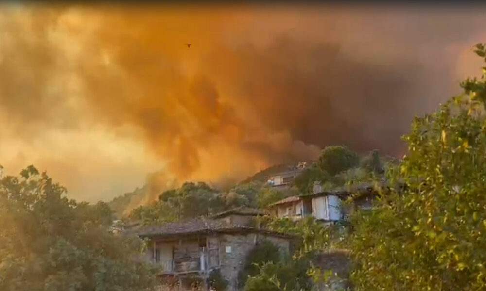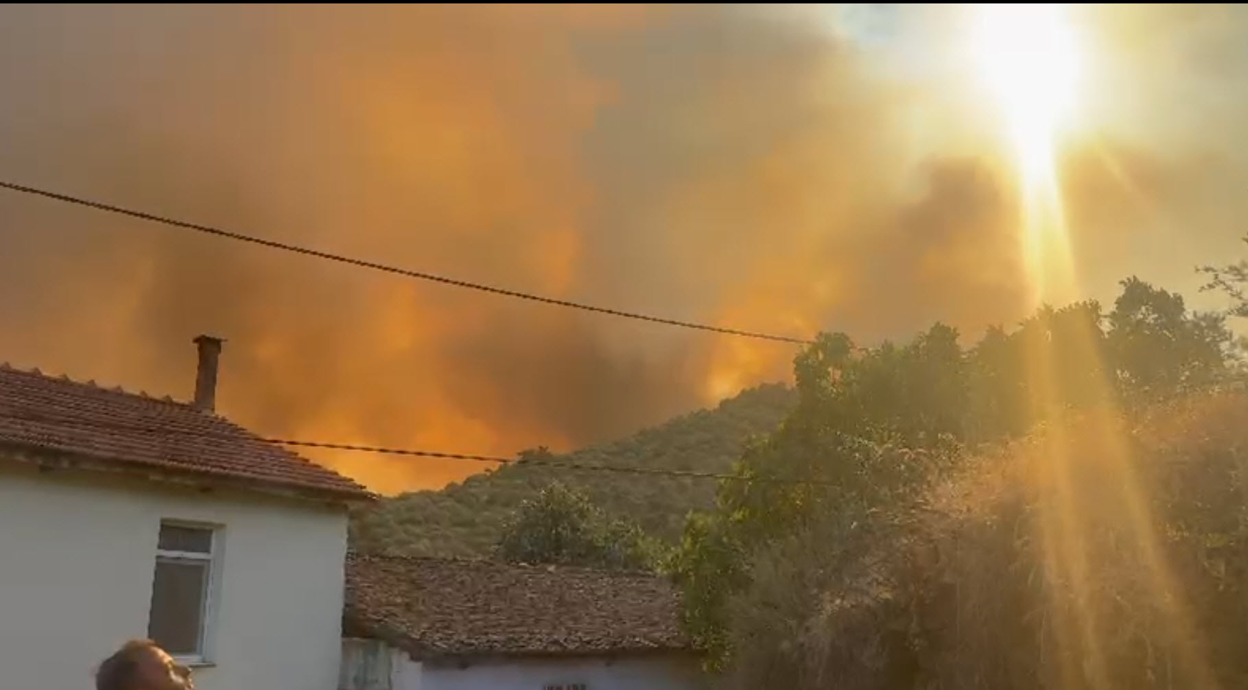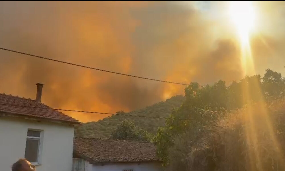 İzmir'in Ödemiş ilçesi Tosunlar Mahallesi Manastır mevkisi yakınlarındaki ormanda dün çıkan yangına müdahale havadan ve karadan sürerken, alevlerin ulaştığı Üzümlü Mahallesi de tahliye edildi.Fotoğraf:İzmir,(DHA)