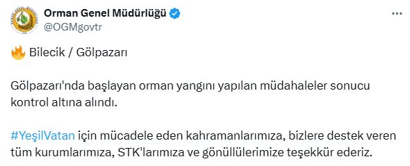 OGMnin sosyal medya hesabından yapılan açıklamada, “Bilecik Gölpazarında başlayan orman yangını yapılan müdahaleler sonucu kontrol altına alındı. Yeşil vatan için mücadele eden kahramanlarımıza, bizlere destek veren tüm kurumlarımıza, sivil toplum kuruluşlarımıza ve gönüllülerimize teşekkür ederiz” ifadelerine yer verildi.