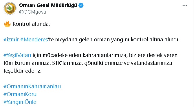 OGMnin sosyal medya hesabından yapılan açıklamada, “İzmir Mendereste meydana gelen orman yangını kontrol altına alındı. Yeşil vatan için mücadele eden kahramanlarımıza, bizlere destek veren tüm kurumlarımıza, STKlarımıza, gönüllülerimize ve vatandaşlarımıza teşekkür ederiz” denildi.