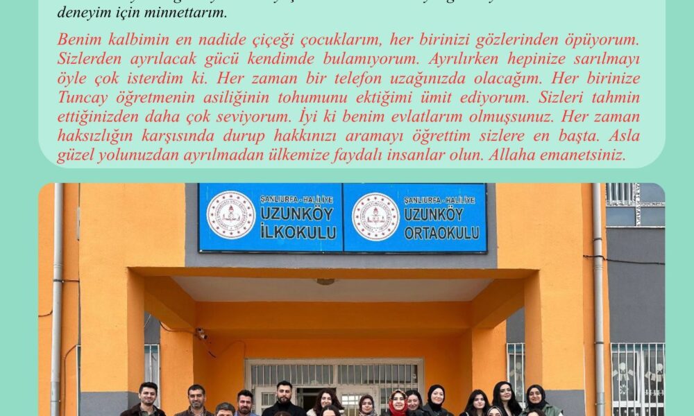 “İlk olarak atama sürecinde adını duyduğum bu okulu aramakla başladı her şey. O kadar samimi konuşuldu ki benimle, kayıtsız kalamadım. Derece yaptığım bir dönemde en üst sıraya yazarak çocuklarıma kavuştum. Senelerdir bu okuldaki çocuklarıma, ülkeme hizmet ettim. Hiçbir zaman velilerimi ya da öğrencilerimi küçümsemedim. Elimden gelenin en iyisini yapmaya çalıştım. Beraber üşüdük, beraber hastalandık ama en güzel anlarda da beraber mutlu olduk. Yaşadığım bu tatsız olayda hiç kimseye, hiçbir öğrencime kızgın ya da kırgın değilim. Buradan gitmem için bir sebep yok derdim hep, çünkü seviyordum. Bir gün ayrılacağımı biliyordum ama bu kadar erken ve acı bir şekilde değil. Bana kattığınız her deneyim için minnettarım.”