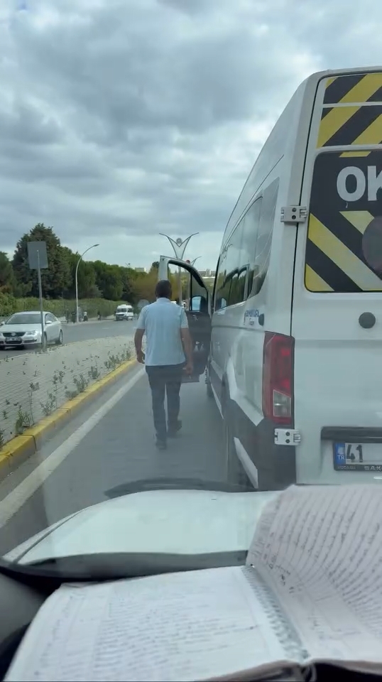 • Kocaeli'nin Gebze ilçesinde servis aracı şoförü trafikte önünü kestiği hafif ticari araç şoförünü ‘Barındırır mıyım seni bu memlekette? Nefesini keserim diyerek tehdit etti. Fotoğraf: (DHA)