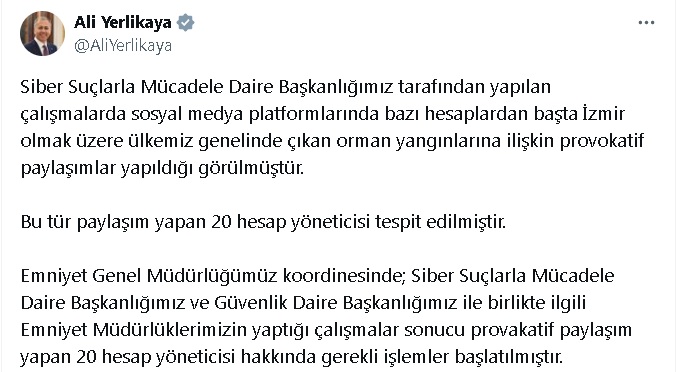 Bakan Yerlikaya, sosyal medya hesabından yaptığı açıklamada, “Siber Suçlarla Mücadele Daire Başkanlığımız tarafından yapılan çalışmalarda sosyal medya platformlarında bazı hesaplardan başta İzmir olmak üzere ülkemiz genelinde çıkan orman yangınlarına ilişkin provokatif paylaşımlar yapıldığı görülmüştür. Bu tür paylaşım yapan 20 hesap yöneticisi tespit edilmiştir. Provakatif paylaşım yapan 20 hesap yöneticisi hakkında gerekli işlemler başlatılmıştır. Orman yangınları gibi milletçe büyük üzüntü duyduğumuz ve devletimizin tüm kurumlarıyla mücadelesini sürdürdüğü bir konuda, halkımız arasına nifak tohumu ekmeye çalışanlara müsaade etmeyeceğiz. Bu tür paylaşım yapanlar adalete teslim edilecektir” dedi.