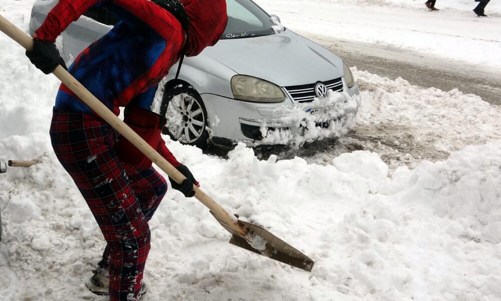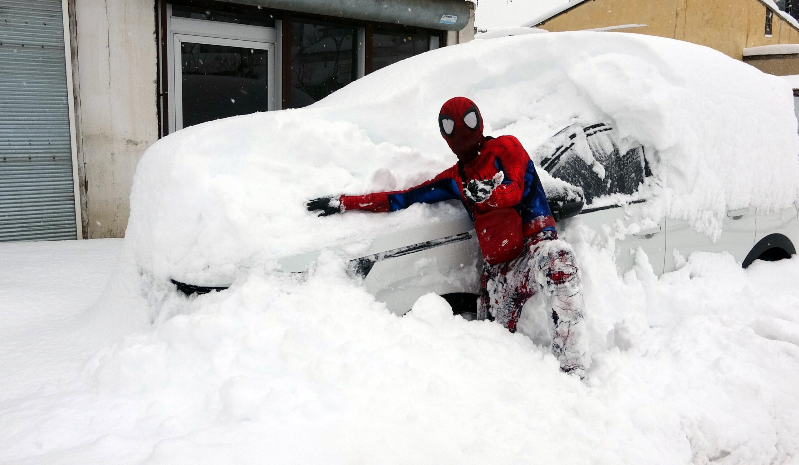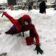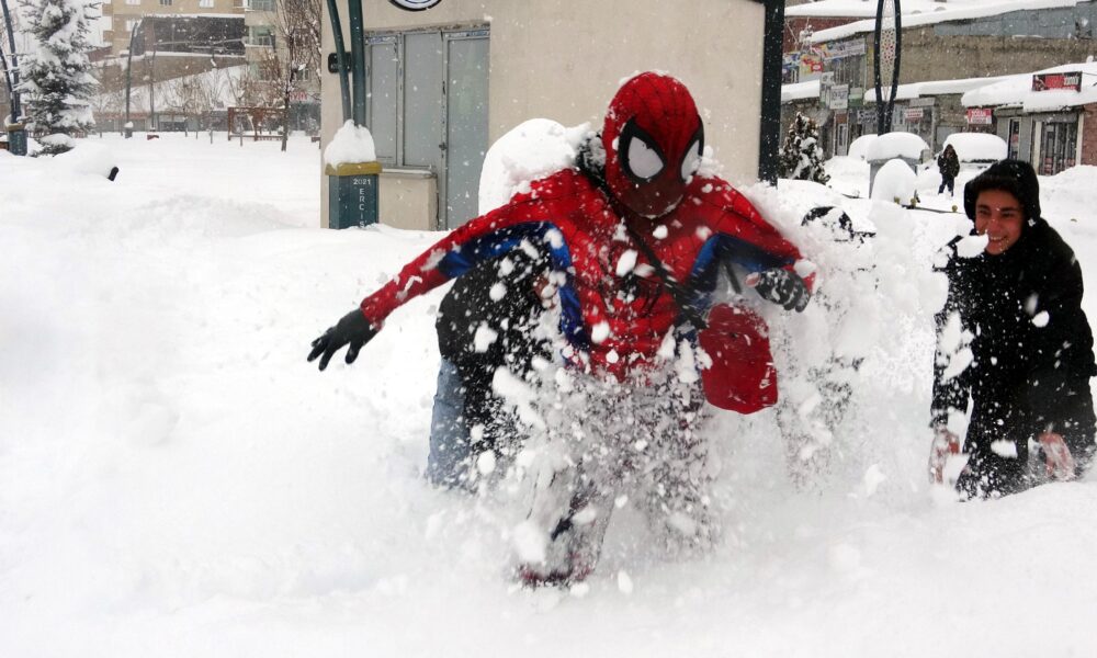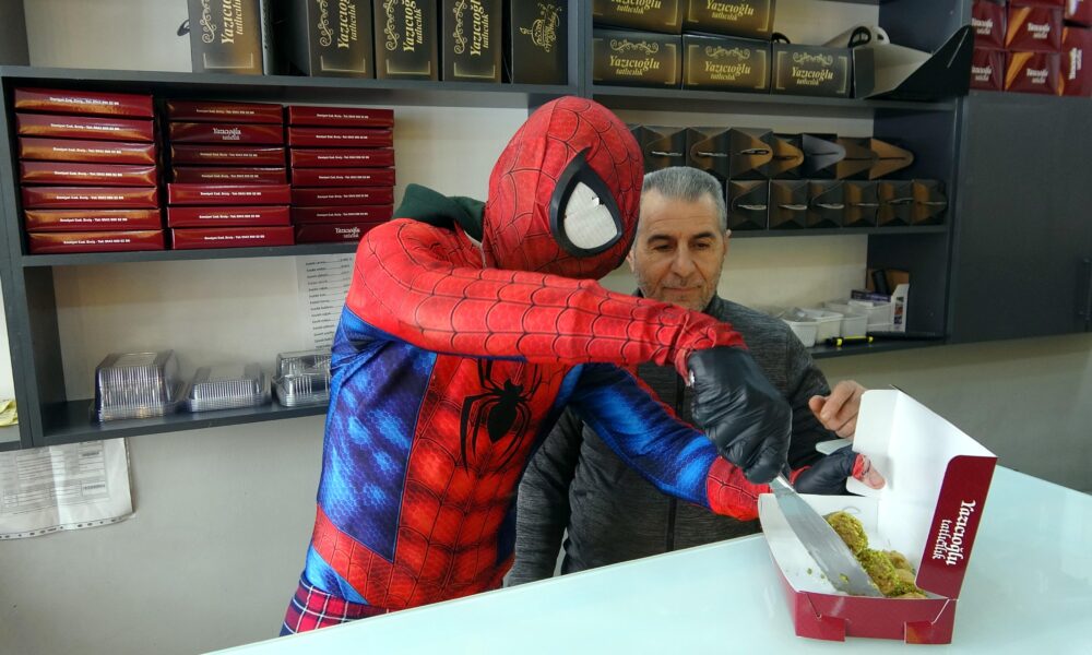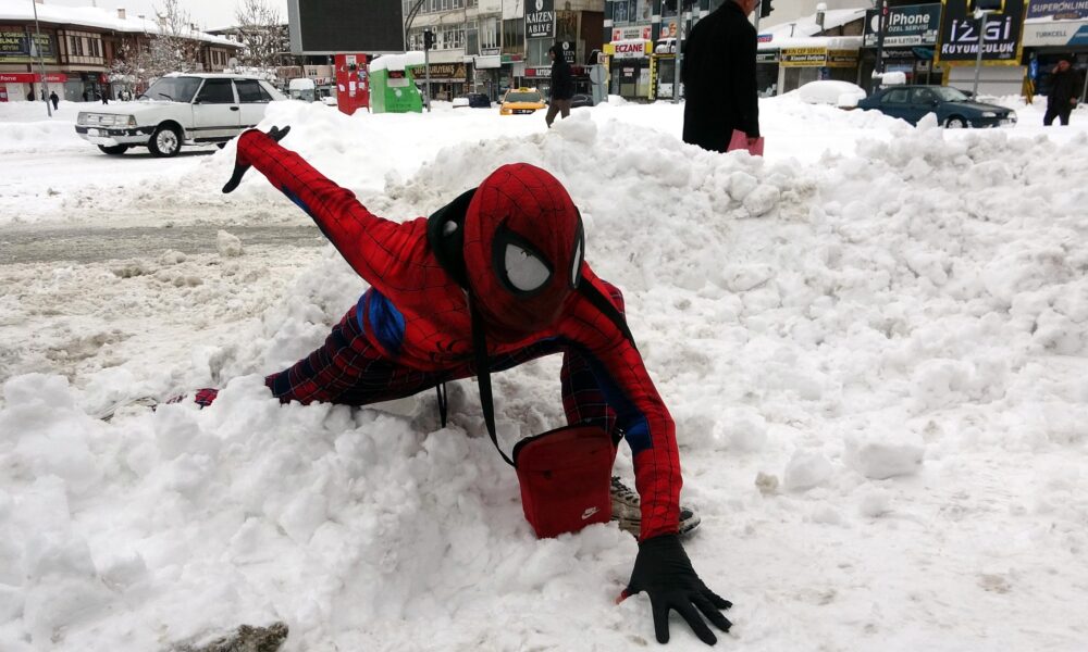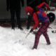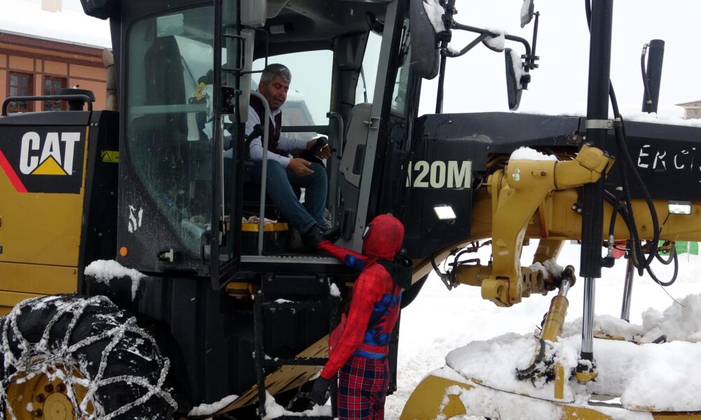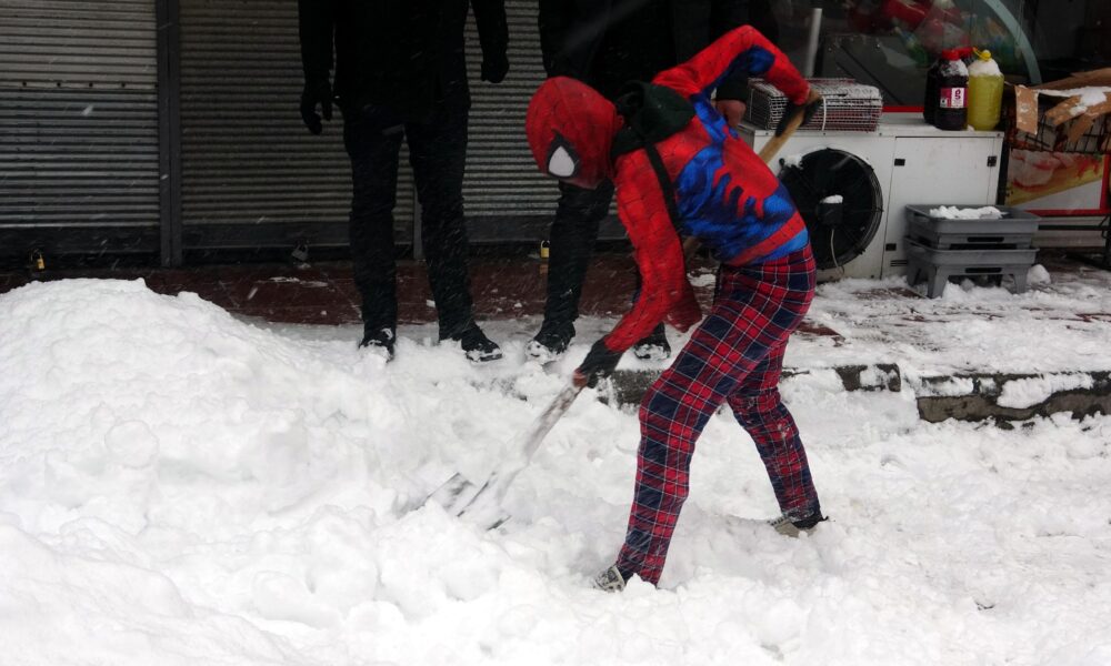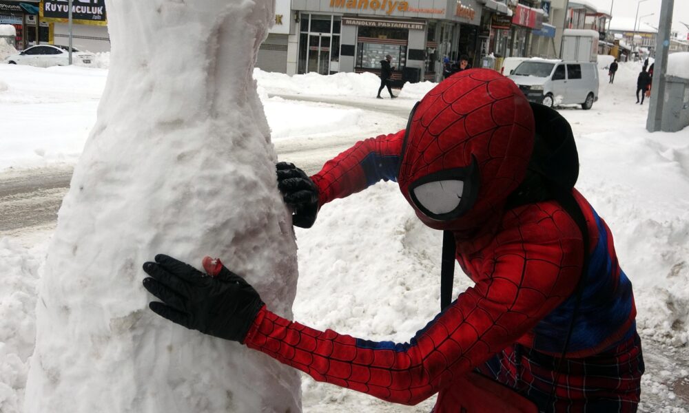 ‘Örümcek Adam’ kostümüyle depremzedeyi ziyaret etti, kaldırım temizleyip çocuklarla kar topu oynadı