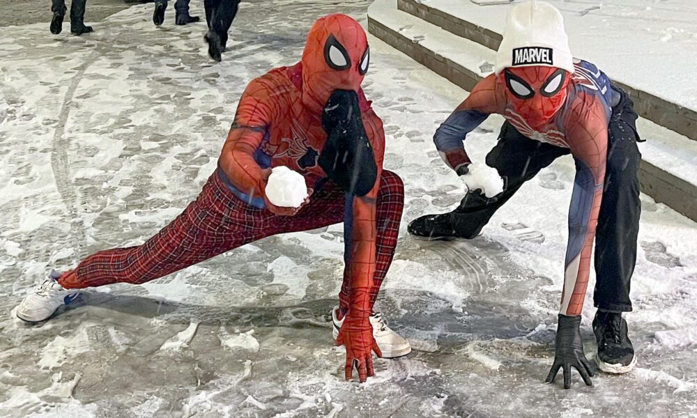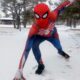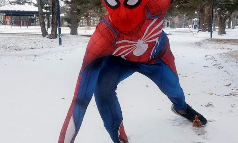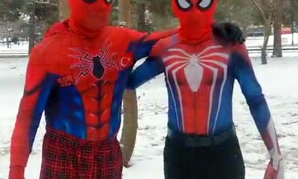 • İzmirli örümcek adam Ayaz Salih Koç (solda) ile Erzincanlı örümcek adam Asaf Özdemir (sağda), kar topu savaş yaptı. Fotoğraf: Erzincan, (DHA)