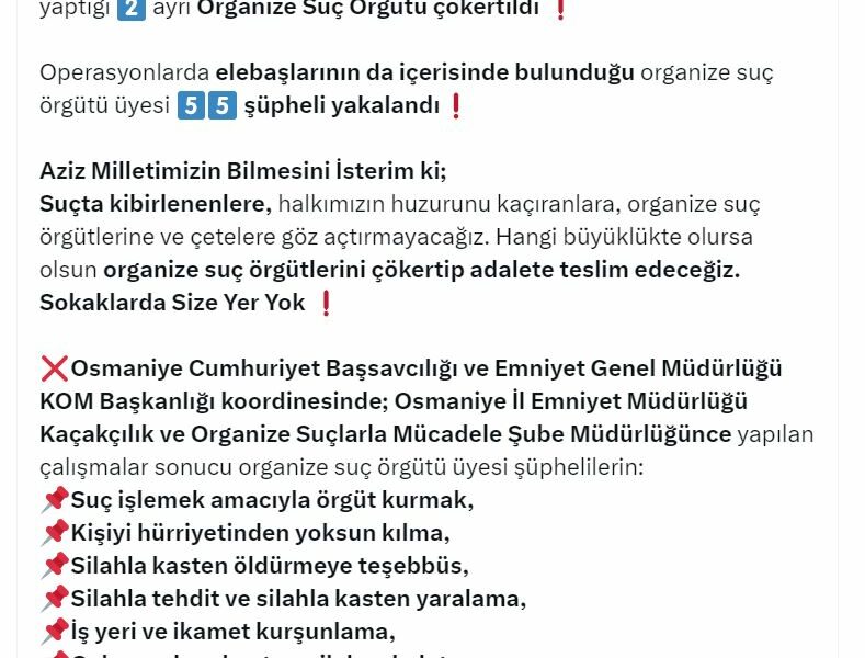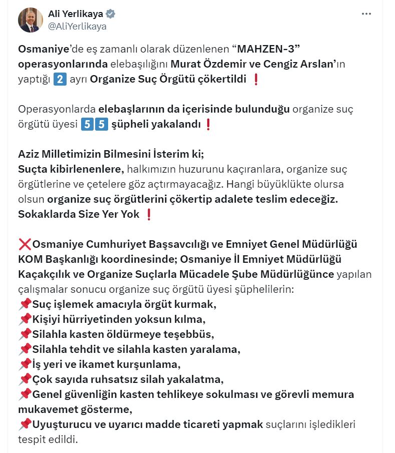 İÇİŞLERİ Bakanı Ali Yerlikaya, Osmaniyede eş zamanlı düzenlenen Mahzen-3 operasyonlarında, elebaşılığını Murat Özdemir ve Cengiz Arslanın yaptığı 2 ayrı organize suç örgütünün çökertildiğini ve 55 şüphelinin yakalandığını duyurdu.Bakan Ali Yerlikayanın sosyal medya hesabından yaptığı açıklamaya göre, Osmaniye İl Emniyet Müdürlüğü Kaçakçılık ve Organize Suçlarla Mücadele Şubesi ekiplerinin çalışması, sonucu organize suç örgütü üyesi şüphelilerin; Suç işlemek amacıyla örgüt kurmak, Kişiyi hürriyetinden yoksun kılma, Silahla kasten öldürmeye teşebbüs, Silahla tehdit ve Silahla kasten yaralama, İş yeri ve ikamet kurşunlama, Çok sayıda ruhsatsız silah yakalatma, Genel güvenliğin kasten tehlikeye sokulması ve Görevli memura mukavemet gösterme ile Uyuşturucu ve uyarıcı madde ticareti yapmak suçlarını işledikleri tespit edildi. Şüphelilere yönelik düzenlenen Mahzen-3 operasyonlarında, örgüt elebaşları Murat Özdemir ve Cengiz Arslanın da aralarında bulunduğu 55 kişi gözaltına alındı. Operasyonlarda 61 ruhsatsız tabanca, 32 tüfek, 1,5 kilo muhtelif uyuşturucu, çok sayıda mermi ve çok miktarda Türk lirasına el koyuldu. Bakan Yerlikaya, “Osmaniye Cumhuriyet Başsavcılığımızı ve operasyonları gerçekleştiren kahraman polislerimizi tebrik ediyorum. Allah ayağınıza taş değdirmesin. Aziz milletimizin bilmesini isterim ki suçta kibirlenenlere, halkımızın huzurunu kaçıranlara, organize suç örgütlerine ve çetelere göz açtırmayacağız. Hangi büyüklükte olursa olsun organize suç örgütlerini çökertip adalete teslim edeceğiz. Sokaklarda size yer yok” dedi.