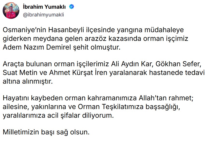 Tarım ve Orman Bakanı İbrahim Yumaklı, sosyal medya hesabından yaptığı açıklamada, “Osmaniyenin Hasanbeyli ilçesinde yangına müdahaleye giderken meydana gelen arazöz kazasında orman işçimiz Adem Nazım Demirel şehit olmuştur. Araçta bulunan orman işçilerimiz Ali Aydın Kar, Gökhan Sefer, Suat Metin ve Ahmet Kürşat İren yaralanarak hastanede tedavi altına alınmıştır. Hayatını kaybeden orman kahramanımıza Allahtan rahmet; ailesine, yakınlarına ve Orman Teşkilatımıza başsağlığı, yaralılarımıza acil şifalar diliyorum. Milletimizin başı sağ olsun” dedi.