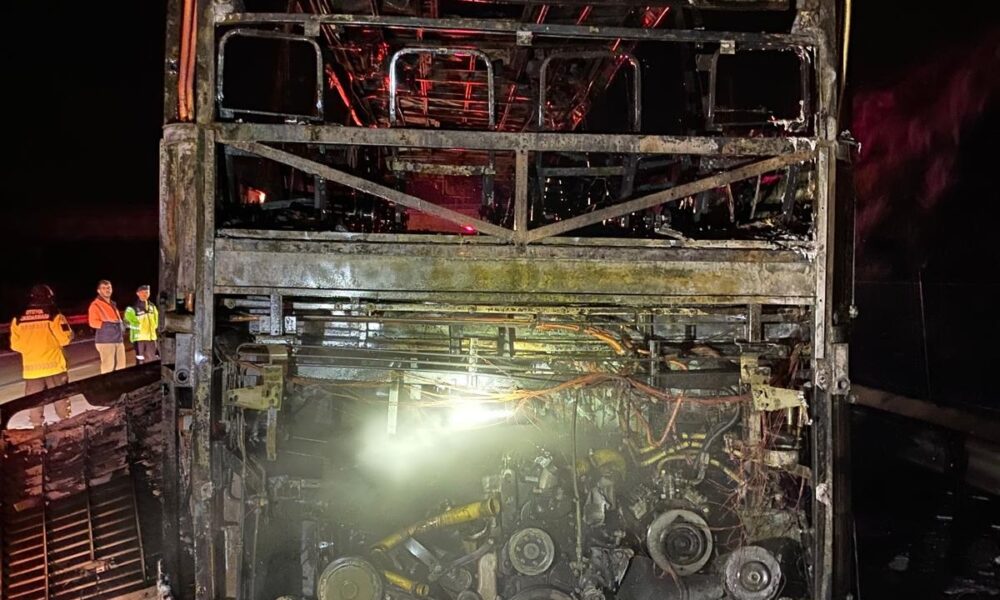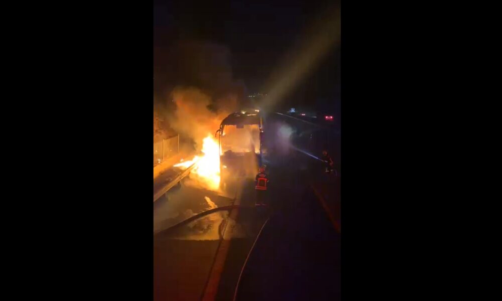 • Osmaniye'de, Adıyaman’dan Mersin’e seyir halinde olan bir yolcu otobüsü otoyolda Toprakkale gişeleri yakınlarında alev aldı. Araç yanarak kullanılamaz hale geldi. Fotoğraf: Osmaniye, (DHA)