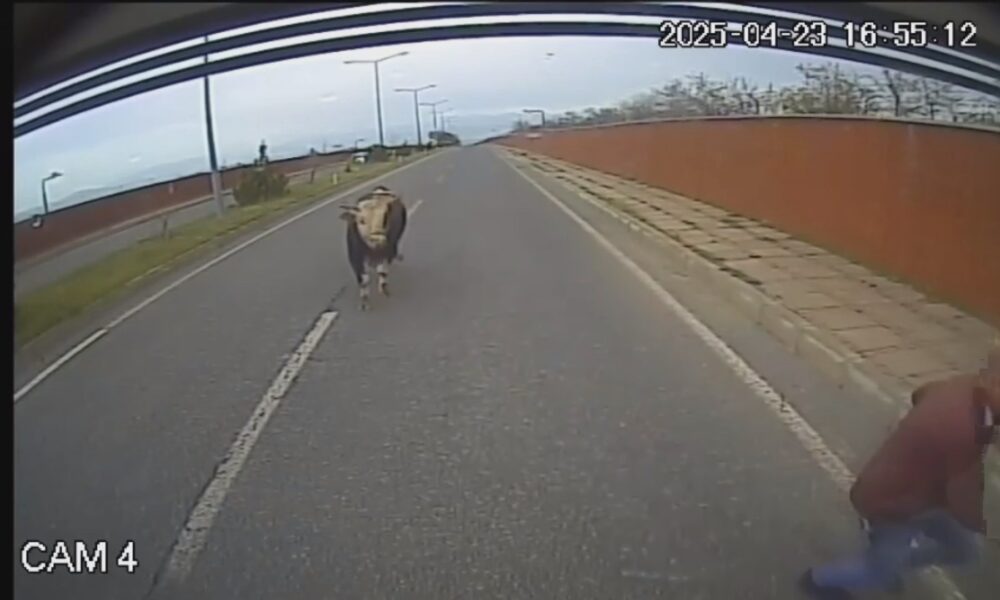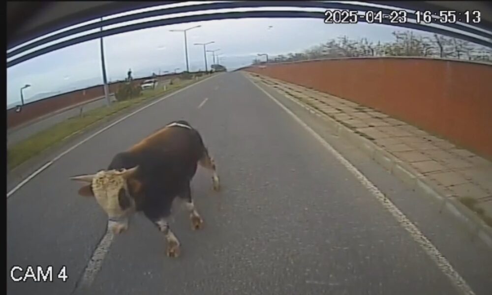 Otobüs şoförü, yola çıkan boğanın saldırısına uğradı; o anlar kamerada