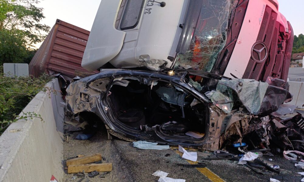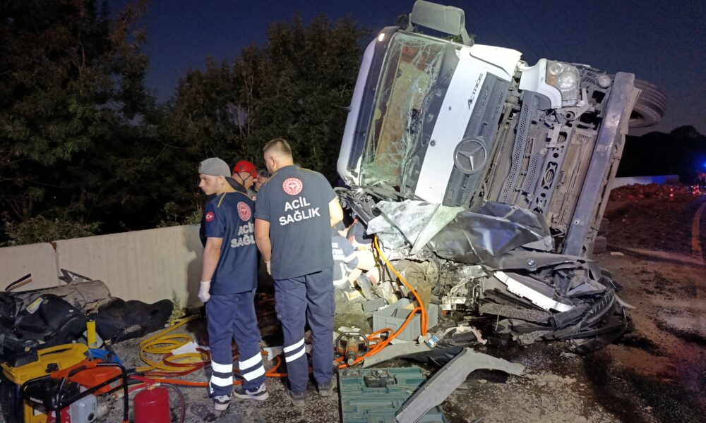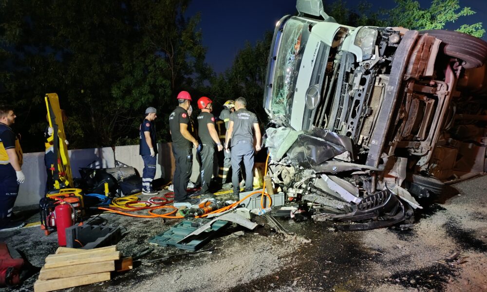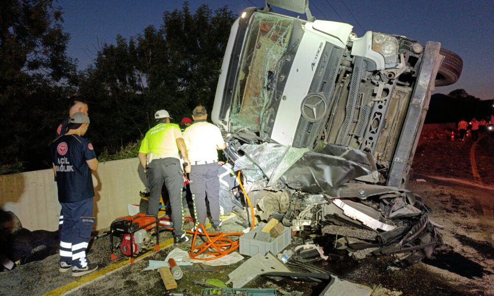 Otobüs ve hafif ticari araca çarpan TIR, otomobilin üzerine devrildi