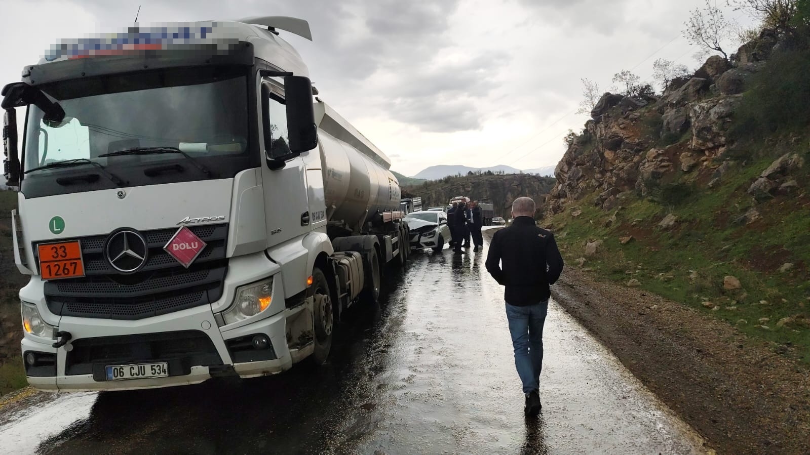 Sürücüsü ve plakası belirlenemeyen TIR, öğle saatlerinde yoldan çıkınca Siirt-Şırnak kara yolunda trafik oluştu. Bu sırada trafikte bekleyen 06 CJU 314 plakalı akaryakıt tankerine, 34 KFY 118 plakalı otomobil arkadan çarptı. Kazada otomobildeki 2si çocuk 4 kişi yaralandı. İhbarla olay yerine sağlık ve polis ekipleri sevk edildi. Yaralılar, ilk müdahalenin ardından çevredeki hastanelere kaldırıldı. Yaralıların durumunun iyi olduğu öğrenilirken, kaza ile ilgili soruşturma başlatıldı.