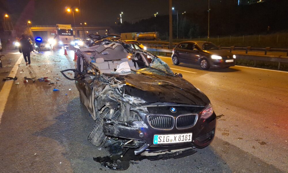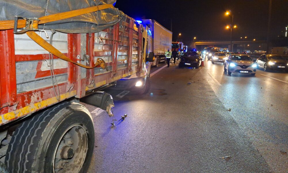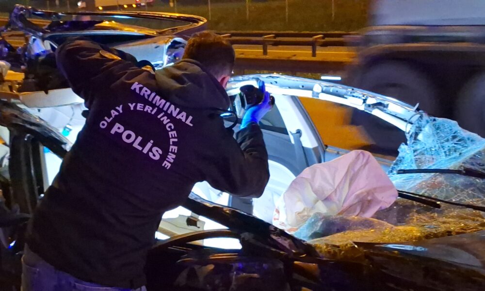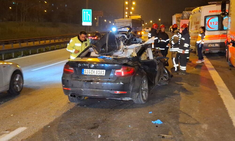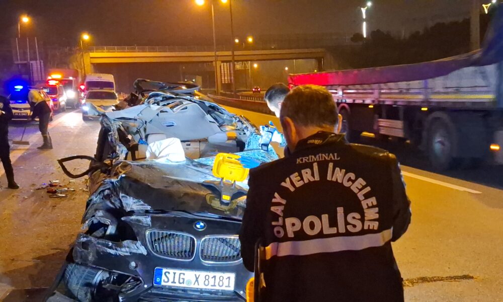 İZMİTte, TEM Otoyolunda sürücüsünün kontrolünden çıkan otomobil, önünde giden TIR’ın altına girerek yaklaşık 30 metre sürüklendi. Kazada tavanı açılan ve içerisinde boş içki şişeleri bulunan otomobildeki 1 kişi öldü, 2 kişi de yaralandı.Kaza gece yarısı TEM Otoyolu İzmit ilçesi Gültepe Dinlenme Tesisleri mevkisinde meydana geldi. İstanbul yönünde seyir halinde olan Orkun Uslu yönetimindeki SIG X 8181 Almanya plakalı otomobil, aynı yönde giden Muhammet Akbaş idaresindeki 15 ACS 136 plakalı TIR’a çarptı. Çarpmanın etkisiyle TIR’ın altına giren otomobil yaklaşık 30 metre sürüklendi. Otomobilin demir yığını haline dönüştüğü kazayı görenlerin ihbarı üzerine bölgeye polis, itfaiye ve acil sağlık ekipleri geldi. İtfaiye ekipleri, tavanı yırtılarak açılan otomobilde bulunan sürücü Uslu ile yolcular Serdar Küçük ve arka koltukta oturan Salih Çil’i sıkıştıkları yerden çıkardı. Sağlık görevlilerinin yaptığı kontrolde Küçük’ün yaşamını yitirdiği belirlenirken, yaralanan Uslu ile Çil, ilk müdahalenin ardından ambulanslarla çevredeki hastanelere kaldırıldı. Küçük’ün cenazesi ise otopsi yapılmak üzere Kocaeli Devlet Hastanesi morguna götürüldü.Kaza nedeniyle otoyolun İstanbul yönünde bir şerit trafiğe kapanırken, araç geçişleri kontrollü olarak sağlandı. Polis ekipleri kullanılamaz hale gelen otomobil üzerinde inceleme yaptı. Ekiplerin çalışmalarında, araç içerisinde boş içki şişeleri buldu. Çalışmaların tamamlanmasının ardından yola saçılan cam ve araç parçaları temizlendi. Kazaya karışan araçların yoldan kaldırılmasının ardından otoyolda trafik akışı normale döndü. Polis ekipleri, TIR sürücüsü Muhammet Akbaş’ı ifadesini almak üzere karakola götürdü. Kazayla ilgili soruşturma başlatıldı.