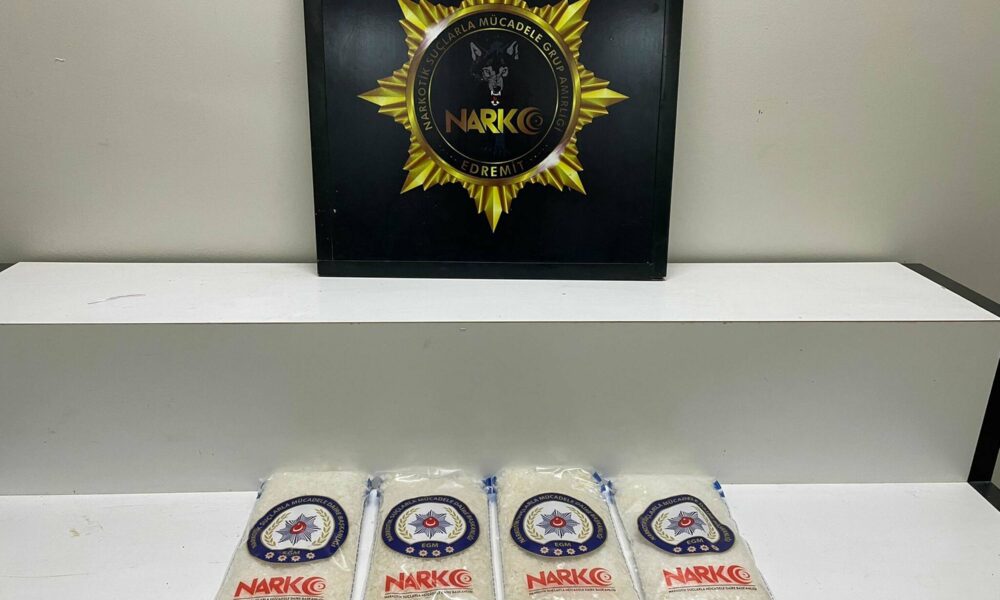 Edremit Narkotik Suçlarla Mücadele Birimi, bir otomobilde uyuşturucu taşındığı bilgisine ulaştı. Ekipler, önceki gün tespit edilen otomobili Edremitte durdurdu. Yapılan aramada, otomobilin bagajındaki kumaşların arasına gizlenmiş 4 kilo 36 gram metamfetamin ele geçirildi. Otomobildeki T.İ (25), M.B. (27) ve S.S. (24) gözaltına alındı. Polisteki işlemlerinin ardından adliyeye sevk edilen şüphelilerden M.B. adlı erkek şüpheli tutuklandı, diğer 2 şüpheli ise adli kontrol şartıyla serbest bırakıldı.