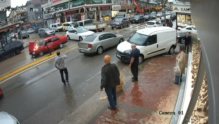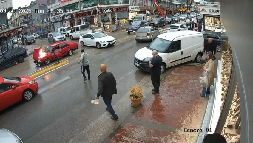 Olay, dün saat 16.30 sıralarında İstasyon Mahallesi Leyla Atakan Caddesi’nde meydana geldi. Sürücüsünün ismi ve plakası öğrenilemeyen seyir halindeki otomobil, cadde üzerinde bir anda alev aldı. Aracını durdurup, çıkan sürücü, otomobilin kaputunu açarken, alevler büyüdü. Durumu fark eden çevredeki bir esnaf dükkanındaki yangın söndürme tüpünü sürücüye verdi. Sürücünün yangın söndürme tüpüyle yaptığı müdahale sonucu alevler söndü.