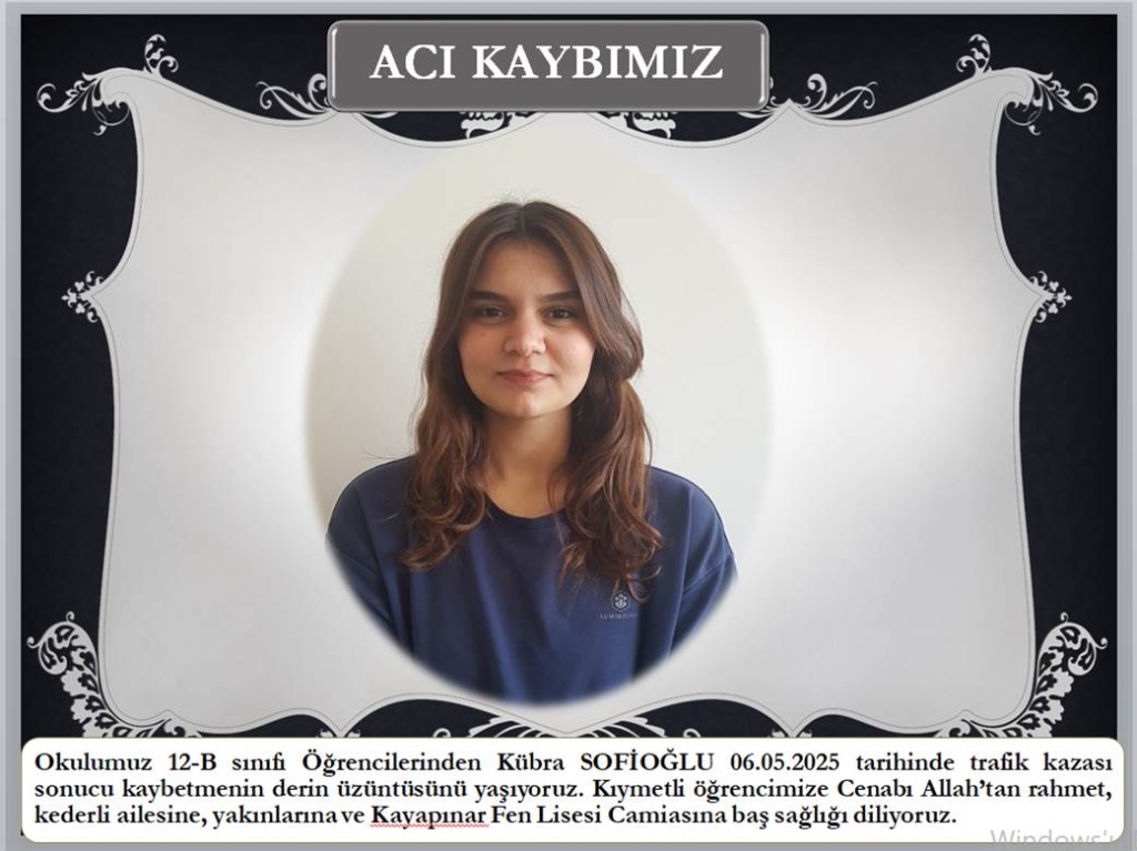 • Diyarbakır'da ehliyetsiz sürücü C.G.’nin (16) yolun karşısına geçmeye çalışırken çarptığı lise öğrencisi Kübra Sofioğlu (17) (Fotoğrafta), hayatını kaybetti. Okulu, kübra için başsağlığı mesajı yayınladı. Fotoğraf: Diyarbakır, (DHA)