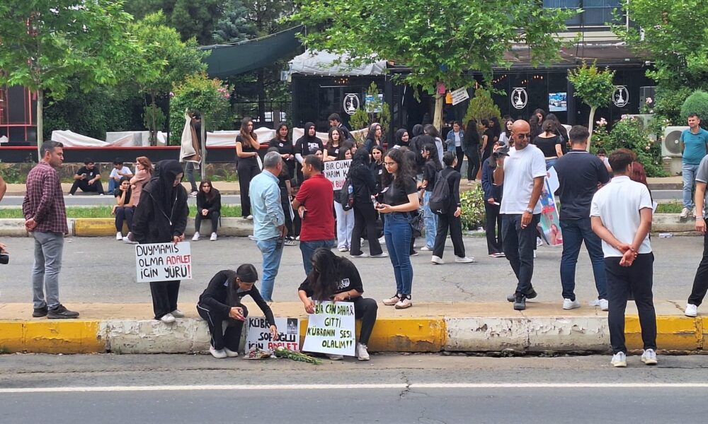 • Diyarbakır'da ehliyetsiz sürücü C.G.’nin (16) yolun karşısına geçmeye çalışırken çarptığı lise öğrencisi Kübra Sofioğlu (17), hayatını kaybetti. Arkadaşları, olay yerinde eylem yaptı. Fotoğraf: Diyarbakır, (DHA)