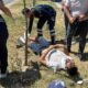Otomobilin çarptığı yayayı güneşten korumak için çuvalla gölge yaptılar