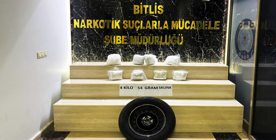 İl Emniyet Müdürlüğü Narkotik Suçlarla Mücadele Şubesi ekipleri, Tatvan ilçe girişinde bir otomobili durdurarak arama yaptı. Aracın yedek lastiğine gizlenmiş 8 parça haline 4 kilo 54 gram skunk ele geçirildi. Araçtaki 4 şüpheli gözaltına alındı. Şüpheliler, emniyetteki işlemlerinin ardından sevk edildikleri mahkemede tutuklandı.