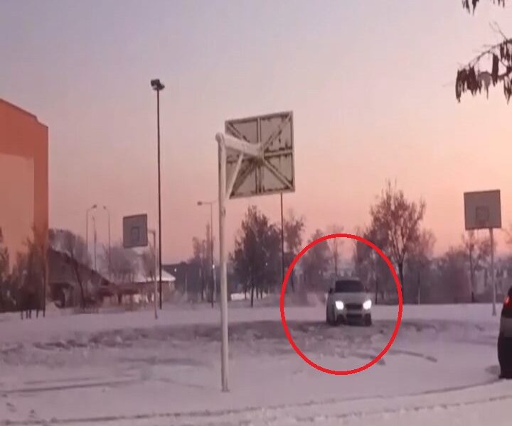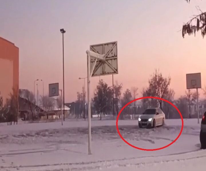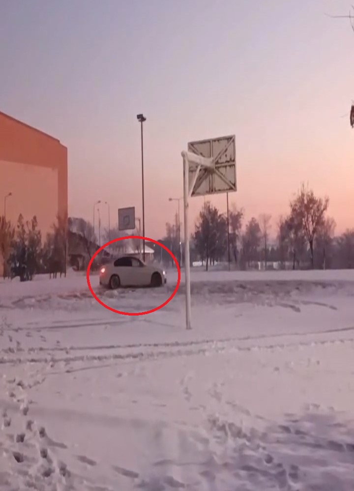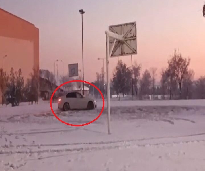 Otomobiliyle, üniversitenin basketbol sahasında kar üzerinde drift attı