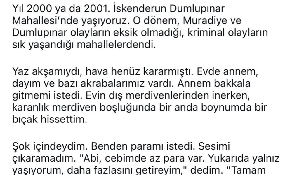 DHAya konuşan Kızılkaya, 14 yaşındayken bu olayı yaşadığını söyleyerek, “Akşam saatleriydi hava sıcaktı. Annem misafirler için bakkaldan bir şeyler almamı istemişti. Ben de tabii aşağı doğru indiğim zaman merdivenimiz binanın dışından bir merdivendi. Dış kapıya çıkarken bir karanlık kör noktası vardı. O esnada tam dış kapıdan çıkarken boynumda bir bıçağın tutulduğunu hissettim. Bir kişi kolumdan tuttu. Yine kendisinin çok farklı bir lisanı vardı. Böyle sanki bir madde kullanıyormuş gibi tam cümleleri söyleyemiyordu. Bana parayı çıkar dedi direkt. Ben de ‘Ne parası, ne diyorsun’ diye şok ve heyecanla o zaman bir panikledim. Tabii benden para istedi. O zaman cebimde çok az, bakkala götürdüğüm kadar para vardı. ‘Daha başka yok mu’ dedi. Ben de yukarıda olduğunu, alıp getireceğimi söyledim. Bana eğer getirmezsen senin boğazını burada keserim dedi. Yukarı çıktım. Yaşadığım korkuyla o dönem evde misafir olan İskenderunda bir devlet kurumunda koruma görevi icra eden dayım vardı. Dayıma durumu anlattım. Tabii olayın heyecanıyla aşağı indik. O esnada tabii kendisi profesyonel güvenlik görevlisi olduğu için elindeki bıçağı alarak olaya müdahale ettik. Şiddetin her türlüsünü kınıyorum; ama o dönemin şartlarında öyle bir olay yaşanınca kendimizi müdafaa etmek zorunda kaldık. Bu esnada komşularımız ve olayı duyan kişiler çıktılar ve bu kişi etkisiz hale getirilmişti o süreçte” diye konuştu.