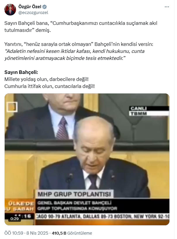 CHP Genel Başkanı Özgür Özel, sosyal medya hesabından MHP Genel Başkanı Devlet Bahçelinin Cumhur İttifakı ortağı olmadan önce TBMM grup toplantısında yaptığı konuşmanın videosunu paylaştı. Özel, paylaşımında, “Sayın Bahçeli bana, Cumhurbaşkanımızı cuntacılıkla suçlamak akıl tutulmasıdır demiş. Yanıtını, henüz sarayla ortak olmayan Bahçelinin kendisi versin; Adaletin nefesini kesen iktidar kafası, kendi hukukunu, cunta yönetimlerini aratmayacak biçimde tesis etmektedir. Sayın Bahçeli; millete yoldaş olun, darbecilere değil, cumhurla ittifak olun, cuntacılarla değil” ifadelerini kullandı.