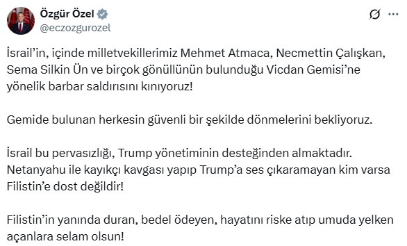 Özgür Özel: İsrail’in, Vicdan Gemisi’ne yönelik barbar saldırısını kınıyoruz