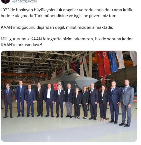 CHP Genel Başkanı Özgür Özel, Türk Havacılık ve Uzay Sanayii A.Ş.yi ziyaretlerinde milli muharip uçak KAANın önünde çektirdikleri fotoğrafı sosyal medya hesabından paylaştı. Özel, “1973te başlayan büyük yolculuk engeller ve zorluklarla dolu ama kritik hedefe ulaşmada Türk mühendisine ve işçisine güvenimiz tam. KAAN’ımız gücünü dışarıdan değil, milletimizden almaktadır. Milli gururumuz KAAN, fotoğrafta bizim arkamızda, biz de sonuna kadar KAAN’ın arkasındayız” ifadelerini kullandı.