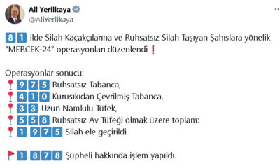 Bakan Yerlikaya, sosyal medya hesabından yaptığı açıklamada, il jandarma komutanlıkları ve il emniyet müdürlükleri tarafından yurt genelinde silah kaçakçıları ve ruhsatsız silah taşıyanlara yönelik Mercek-24 operasyonları...