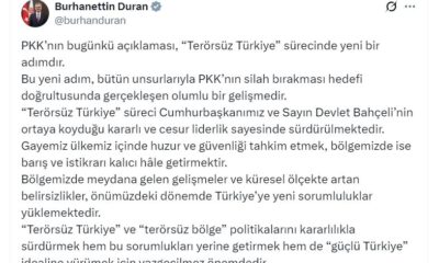 İletişim Başkanı Burhannettin Duran: PKK’nın bugünkü açıklaması, Terörsüz Türkiye sürecinde yeni bir adımdır. Bu yeni adım, bütün unsurlarıyla PKK’nın silah bırakması hedefi doğrultusunda gerçekleşen olumlu bir...