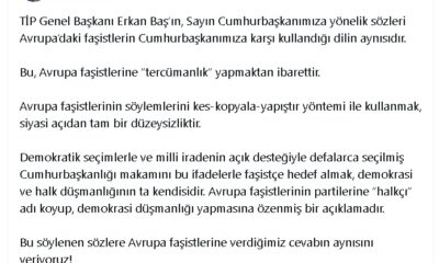 AK Parti Sözcüsü Çelik, sosyal medya hesabından yaptığı paylaşımda, “TİP Genel Başkanı Erkan Baş’ın Sayın Cumhurbaşkanımıza yönelik sözleri Avrupa’daki faşistlerin Cumhurbaşkanımıza karşı kullandığı dilin aynısıdır. Bu,...