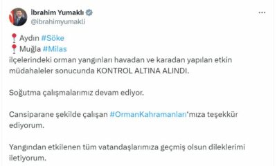 Tarım ve Orman Bakanı İbrahim Yumaklı, sosyal medya hesabından yaptığı açıklamada, “Aydının Söke ve Muğlanın Milas ilçelerindeki orman yangınları havadan ve karadan yapılan etkin müdahaleler sonucunda...