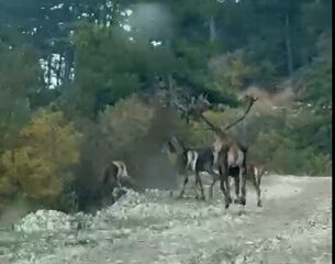 Göynük ilçesi Bozcaarmut köyü mevkisinde aracıyla seyreden kişi, ormandan inen geyik sürüsüyle karşılaştı. Sürücü, geyikleri cep telefonuyla görüntüledi. Aracın önünde koşan geyikler tekrar ormana giderek gözden...