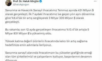 Savunma Sanayii Başkanı Görgün, sosyal medya hesabından yaptığı açıklamada, “Savunma ve havacılık sanayii ihracatımız temmuz ayında 431 milyon dolar olarak gerçekleşti. İlk 7 aydaki ihracatımız ise...