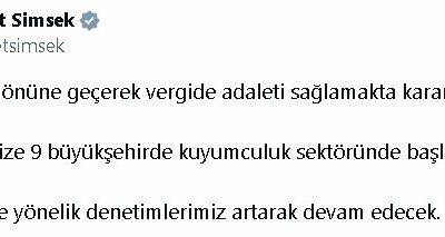 Bakan Şimşek, sosyal medya hesabından yaptığı açıklamada, “Kayıt dışılığın önüne geçerek vergide adaleti sağlamakta kararlıyız. Denetimlerimize 9 büyükşehirde kuyumculuk sektöründe başladık. Tüm sektörlere yönelik denetimlerimiz artarak...