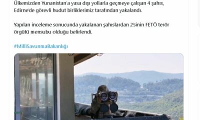 Bakanlığın sosyal medya hesabından yapılan açıklamada, “Hudutlarımızın güvenliği için yasa dışı geçişlere karşı mücadelemiz sürüyor. Ülkemizden Yunanistana yasa dışı yollarla geçmeye çalışan 4 şahıs, Edirnede görevli...