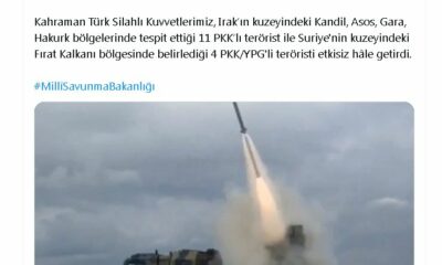 Bakanlığın sosyal medya hesabından yapılan açıklamada, “Öngörülemez, alışılmadık, süratli ve sürekli. Kahraman Türk Silahlı Kuvvetlerimiz, Irakın kuzeyindeki Kandil, Asos, Gara, Hakurk bölgelerinde tespit ettiği 11 PKKlı...