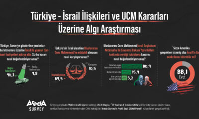 Türkiye genelinde 2 bin 503 kişiyle gerçekleştirdiği araştırmada Türk halkının yüzde 90,2’si Türkiye’nin İsrail’e uyguladığı ticaret ambargosunu destekliyor. Buna karşın yüzde 9,8’i ise bu ambargoyu desteklemiyor....