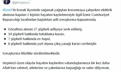 Adalet Bakanı Yılmaz Tunç, sosyal medya hesabından yaptığı açıklamada, İzmirin Konak ilçesinde sağanak yağıştan korunmaya çalışırken elektrik akımına kapılan 2 kişinin hayatını kaybetmesiyle ilgili İzmir Cumhuriyet...