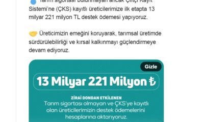 Bakan Yumaklı, NSosyal hesabından yaptığı açıklamada, “Zirai dondan etkilenen üreticilerimizin yanında olmayı sürdürüyoruz. Tarım sigortası bulunmayan ancak Çiftçi Kayıt Sistemi’ne (ÇKS) kayıtlı üreticilerimize ilk etapta 13...