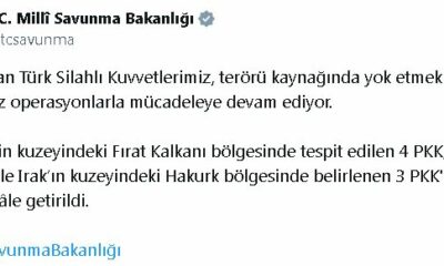 Bakanlığın sosyal medya hesabından yapılan açıklamada, “Kahraman Türk Silahlı Kuvvetlerimiz, terörü kaynağında yok etmek için kesintisiz operasyonlarla mücadeleye devam ediyor. Suriyenin kuzeyindeki Fırat Kalkanı bölgesinde tespit...