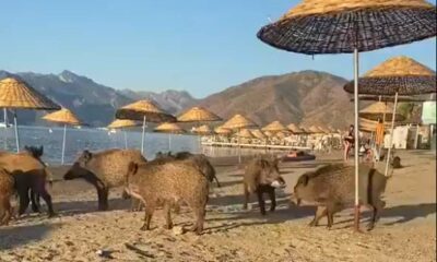 Domuz sürüsü, Marmariste halk plajına indi. Plajda şezlonglar arasında gezinen domuzları gören yerli-yabancı turistler, o anları cep telefonu kamerası ile kaydetti. Uzun süre plajdaki şezlongların arasında...