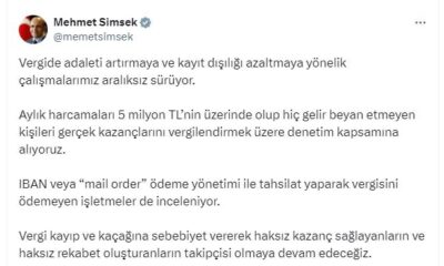 Bakan Şimşek, sosyal medya hesabı üzerinden açıklamada bulundu. Bakan Şimşek, “Vergide adaleti artırmaya ve kayıt dışılığı azaltmaya yönelik çalışmalarımız aralıksız sürüyor. Aylık harcamaları 5 milyon TL’nin...