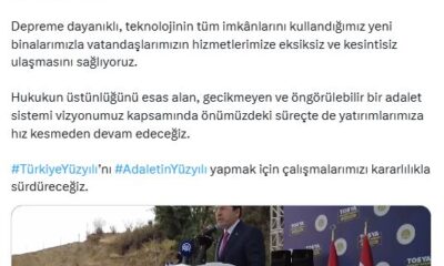 Bakan Yılmaz Tunç, sosyal medya hesabından yaptığı videolu paylaşımda depreme dayanıklı, teknolojinin tüm imkanlarının kullanıldığı yeni binalarla vatandaşların adalet hizmetlerine eksiksiz ve kesintisiz şekilde ulaşmasını sağladıklarını...