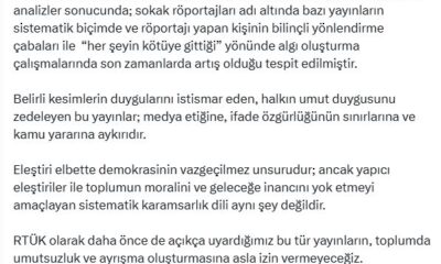 RTÜK Başkanı Ebubekir Şahin, sosyal medya hesabından yaptığı açıklamada, “Üst Kurulumuzun izleme ve değerlendirme uzmanları tarafından yapılan analizler sonucunda; sokak röportajları adı altında bazı yayınların sistematik...