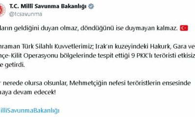 Bakanlığın sosyal medya hesabından yapılan açıklamada, “Onların geldiğini duyan olmaz, döndüğünü ise duymayan kalmaz. Kahraman Türk Silahlı Kuvvetlerimiz; Irakın kuzeyindeki Hakurk, Gara ve Pençe-Kilit Operasyonu bölgelerinde...
