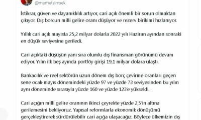 Bakan Şimşek, sosyal medya hesabından yaptığı açıklamada, “İstikrar, güven ve dayanıklılık artıyor, cari açık önemli bir sorun olmaktan çıkıyor. Dış borcun milli gelire oranı düşüyor ve...