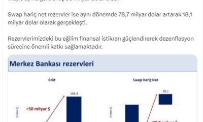 Bakan Şimşek, sosyal medya hesabından açıklama yaptı. Şimşek, “Rezervlerimiz güçlenmeye, rezerv yeterliliğimiz iyileşmeye devam ediyor. Brüt rezervler 148,4 milyar dolarla tarihi zirvesine ulaşırken geçen yıl mayıs...